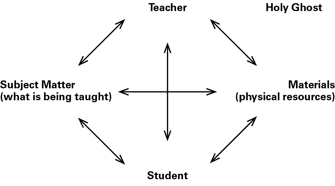 Spiritual excellence, which should be of particular import to the gospel teacher, is assisted through appropriate balance of the four teaching components. Harmonious arrangements attained through balance set the stage for spiritual experience shared by teacher and student because of the relevance and compatibility that is engendered. But gospel teaching is distinctive in that, to be most powerful, it must involve a fifth component—the Spirit of the Holy Ghost. The complete model would then appear as follows in figure 2.