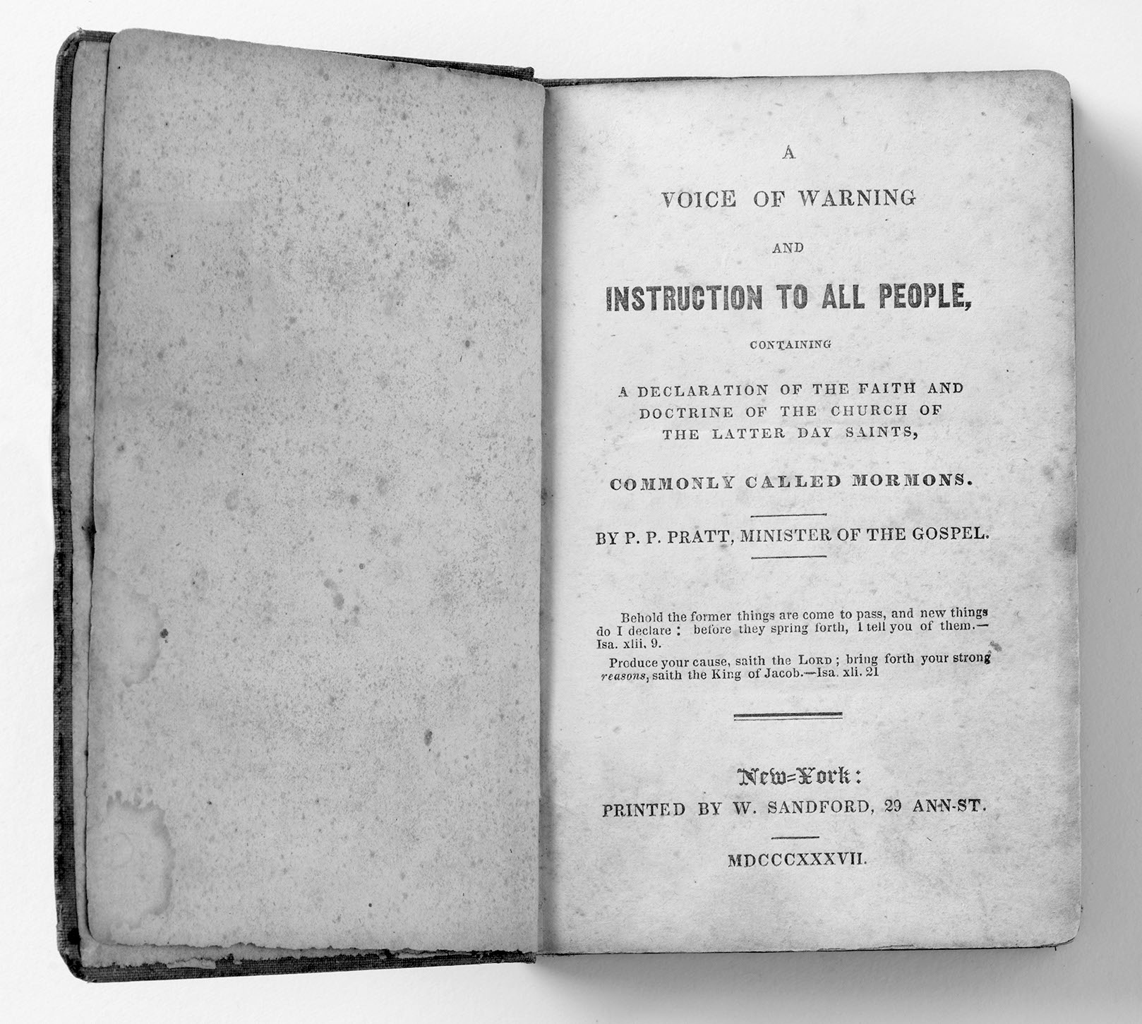 5. A Voice of Warning, a catalytic 216-page tract written by Elder Parley P. Pratt, published in 1837, had a profound impact on many Latter-day Saint conversions. Pratt’s biographers, Terryl L. Givens and Matthew J. Grow, argue that from the time A Voice of Warning was published, it “served the church as its most powerful proselytizing tool—after the Book of Mormon—for more than a century.” It was eventually printed in over thirty English-language editions. See Terry L. Givens and Matthew J. Grow, Parley P. Pratt: The Apostle Paul of Mormonism (New York: Oxford University Press, 2011), 90, 103, 119; see also Parley P. Pratt, A Voice of Warning and Instruction to All People, Containing a Declaration of the Faith and Doctrine of the Church of the Latter-day Saints, Commonly Called Mormons (New York: Sandford, 1837).