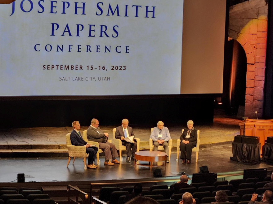 Panel at the September 2023 Joseph Smith Papers Conference. Left to right: Brent Rogers, Ron Barney, Elder Marlin K. Jensen, Ron Esplin, Gail Miller. Courtesy Brooke Jurges.