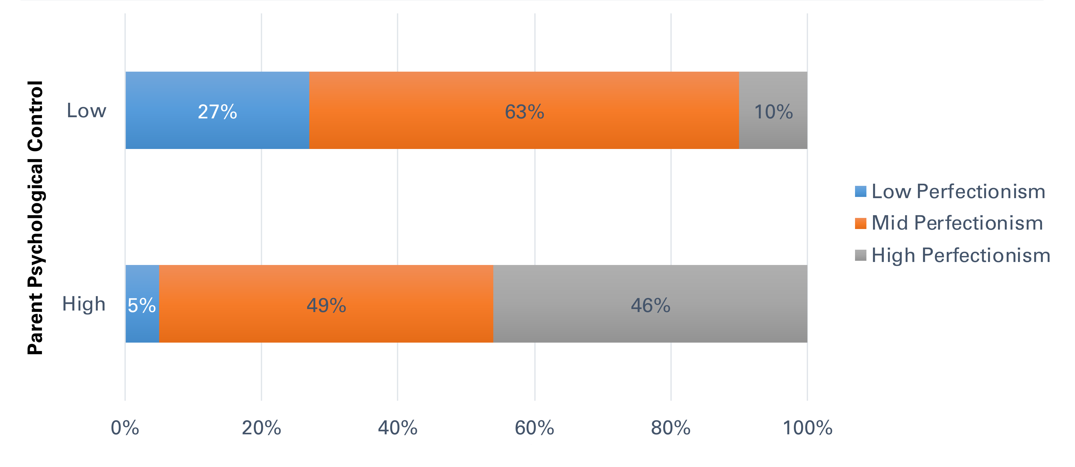 When considering mother and father psychological control together, we found that 46% of girls whose parents were both high on psychological control had high perfectionism. This is compared to just 10% of girls being high in perfectionism when both parents were low in psychological control. In other words, high parental psychological control in both parents increased the likelihood of daughters being high in toxic perfectionism by nearly five times (see fig. 1).