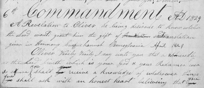 It is little wonder, then, that John Whitmer, in his manuscript copy of this revelation, hesitated on whether to describe Oliver’s gift as one of “revelation” or “translation.” This ambivalence is captured in a revealing strikethrough (fig. 1): “A Revelation to Oliver [Cowdery] he being desirous to know whether the Lord would grant him the gift of Revelation & th◊ Translation given in Harmony Susquehannah Pennsylvania April 1829.”24