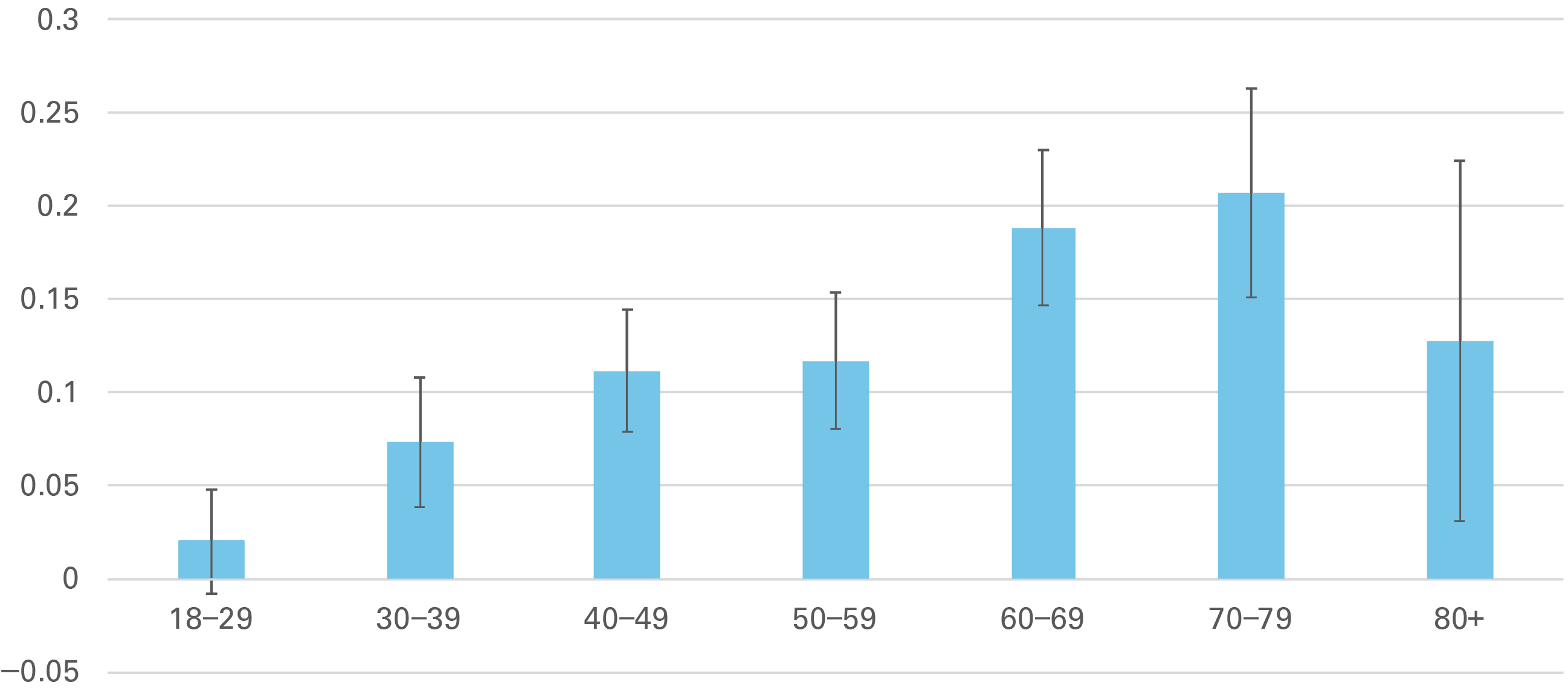 As seen in table 1, the number of current members who are married but not sealed is relatively low. Much higher are temple marriages of members who were sealed later. Still, the summary statistics suggest that the probability of temple marriages ending in divorce is quite low, in the teens. While the sample sizes for the other categories are too small to split by age, we combined the different survey subsamples and have a large enough sample to chart age-specific probabilities of a temple marriage ending in divorce. Again, this is not a time-since-marriage estimate, and to some extent, a person’s age is proxying for cohort (the era somebody was born in). Still, showing probabilities by age provides insight into possible lifetime divorce rates for temple marriages. Because the weighting is largely based on age distributions anyway, we show unweighted estimates for simplicity.