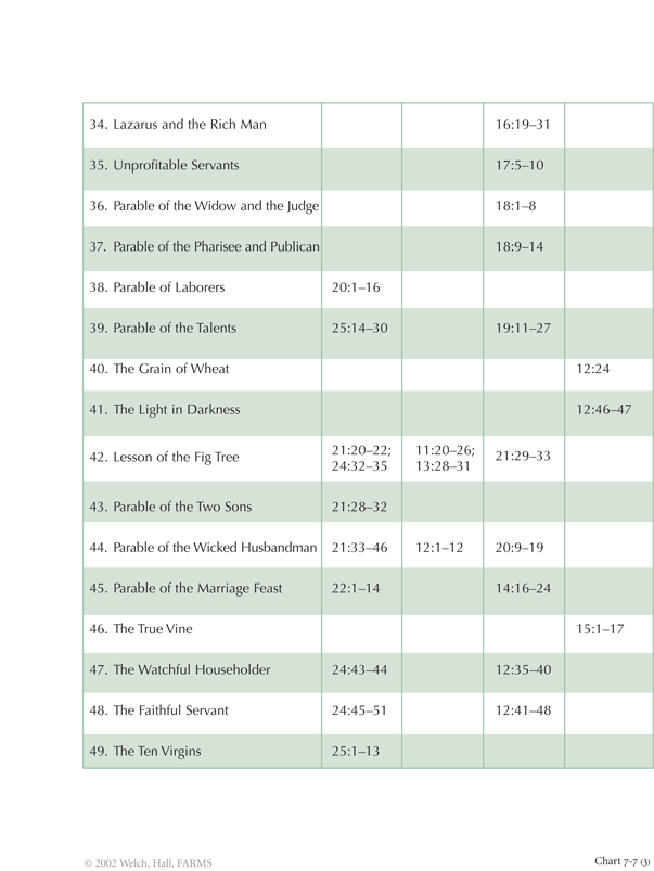 Special groupings of segments from the four Gospels are broken out for convenience in the next few charts. Was Jesus a sage who focused mainly on teaching, or was he primarily a man of action? The first two charts in this section show that he equally did both. The forty-nine main parables or metaphors spoken by Jesus are arrayed in chart 7-7, with the forty-two most impressive miracles that he performed, presented on chart 7-8. Jesus was Savior both in word and deed, and thus he praised any person who both "heareth these sayings of mine and doeth them" (Mt 7:24).