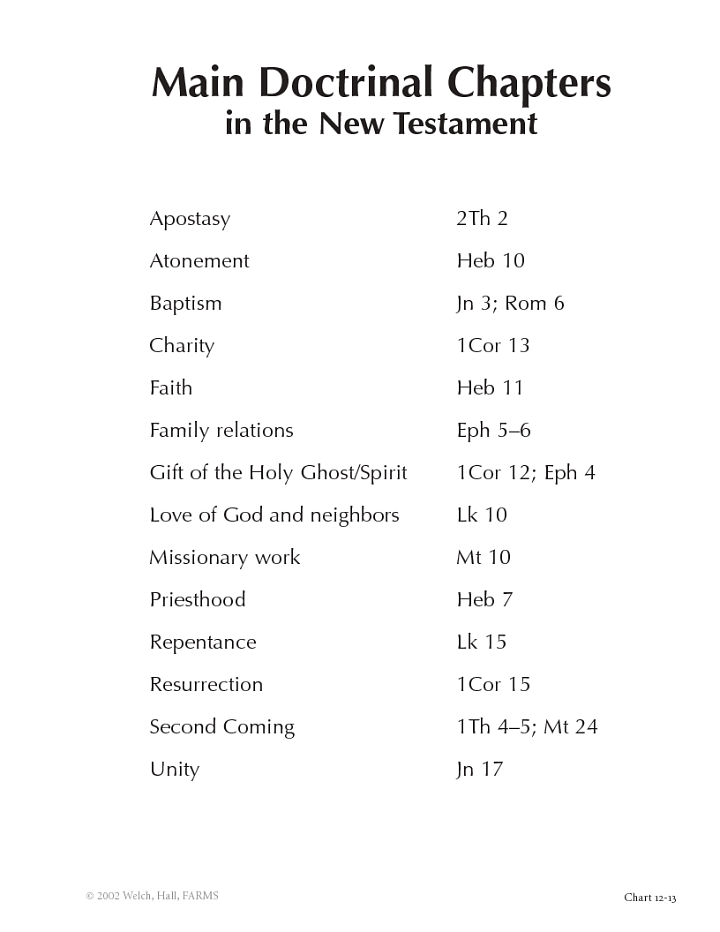 Certain chapters in the New Testament are especially famous. These doctrinal highlights express key concepts in unforgettably eloquent or powerful terms. To the list in chart 12-13 could be added many other topics and chapters, but those listed are certainly among the top favorites concerning the first principles and ordinances of the gospel (namely faith, repentance of the prodigal son, baptism, and the gift of the Holy Ghost), Christian living (charity, love of the good Samaritan, family relations, missionary work, priesthood, and unity), and the salvation history of the world (atonement, apostasy, second coming, and resurrection).