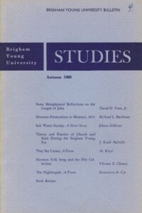 Other articles include a metaphysical interpretation of the Gospel of John by David H. Yarn, Jr., a critique of Austin Fife's collection of Mormon folk songs by Thomas E. Cheney, and a short story by Eileen Gibbons about a mother's struggle as her family adjusts to a summer living on the Great Salt Lake.
