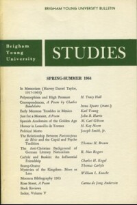 Charles H. Kegel explains how "one of the most powerful, sustained, and influential relationships between major literary figures of nineteenth century England was that which existed between Thomas Carlyle and John Ruskin." He explores how this friendship was able to survive in "Carlyle and Ruskin: An Influential Friendship." The first Mormon colonists in Mexico suffered greatly through trials and diseases. Karl Young explores their timeline in "Early Mormon Troubles in Mexico." Also read the article by R. Max Rogers entitled, "The Anti-Christian Background of German Literary Naturalism."